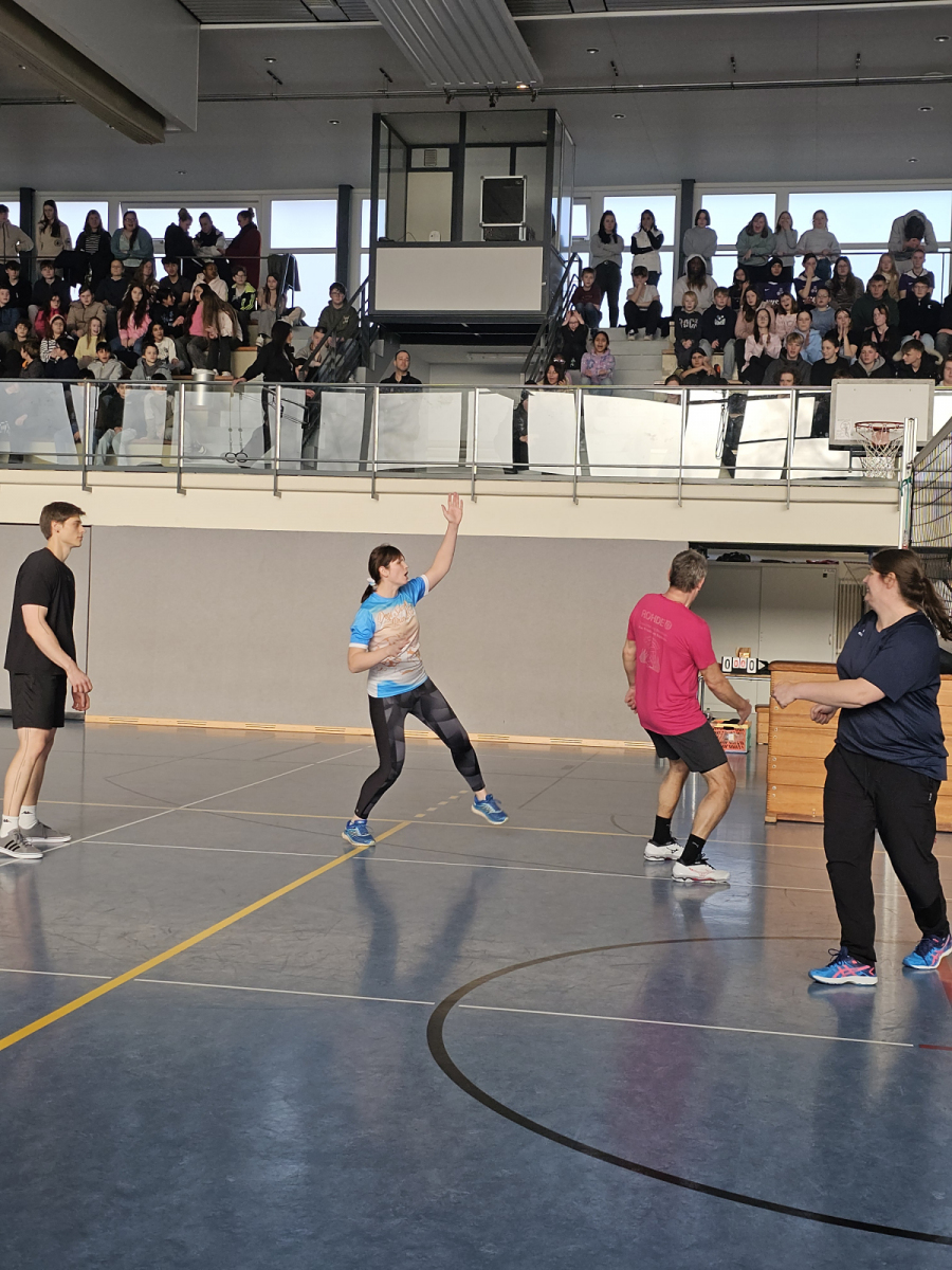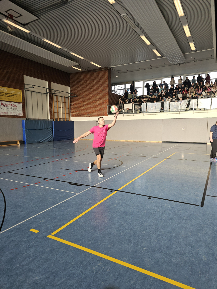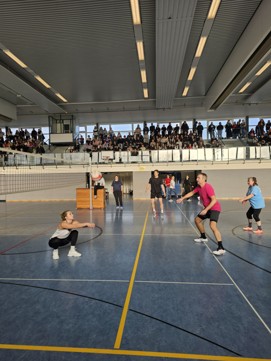 Highlight der Turnierwoche war am Mittwoch das Spiel der Siegermannschaft des Volleyballturnieres gegen das Lehrerteam. Die Schüler:innen haben dieses Spiel zwar für sich entschieden, aber die Lehrkräfte haben sich nicht einfach zu schlagen gegeben. Das Spiel wurde lauthals von allen Schülerinnen und Schülern der übrigen Klassen mit Anfeuerungsrufen unterstützt.
